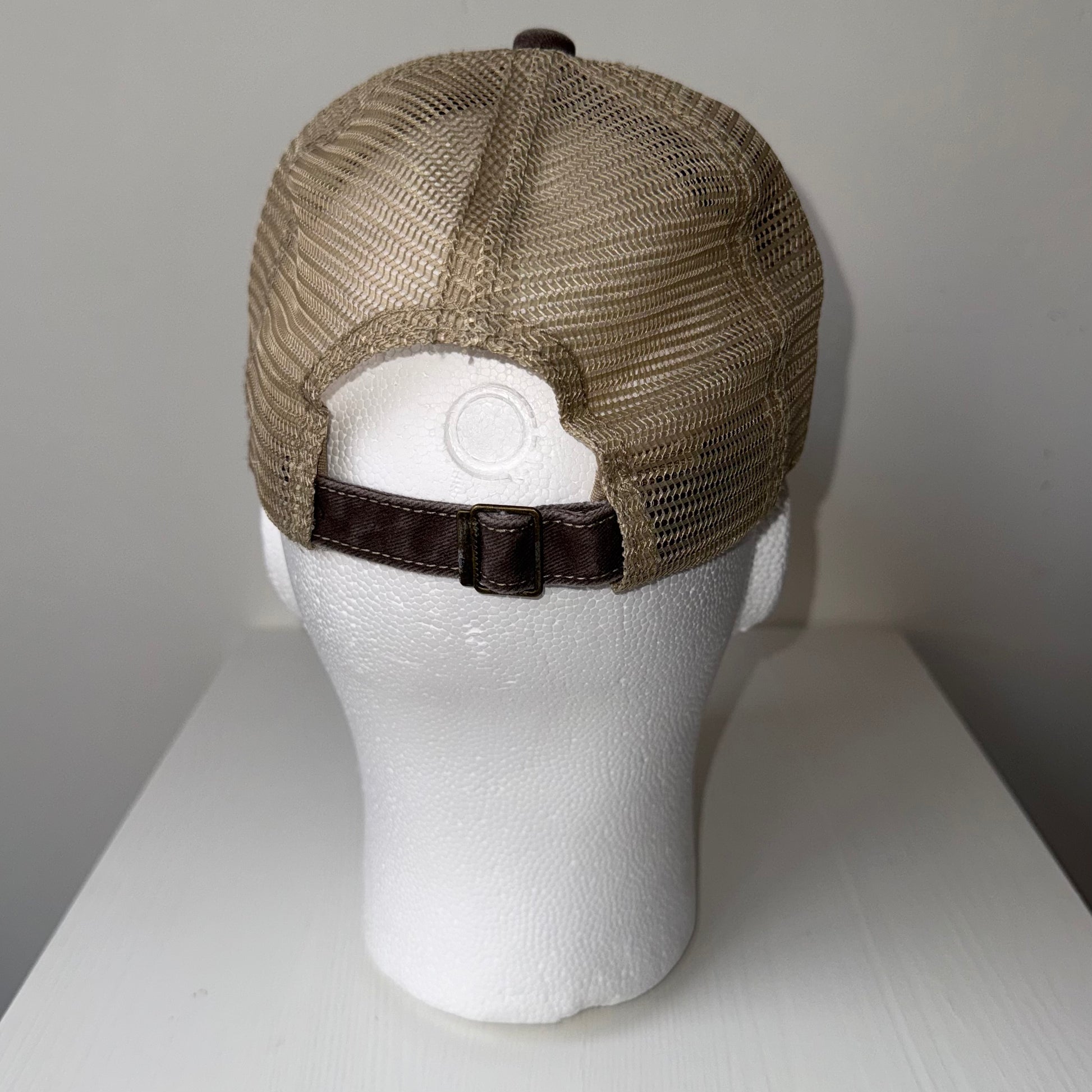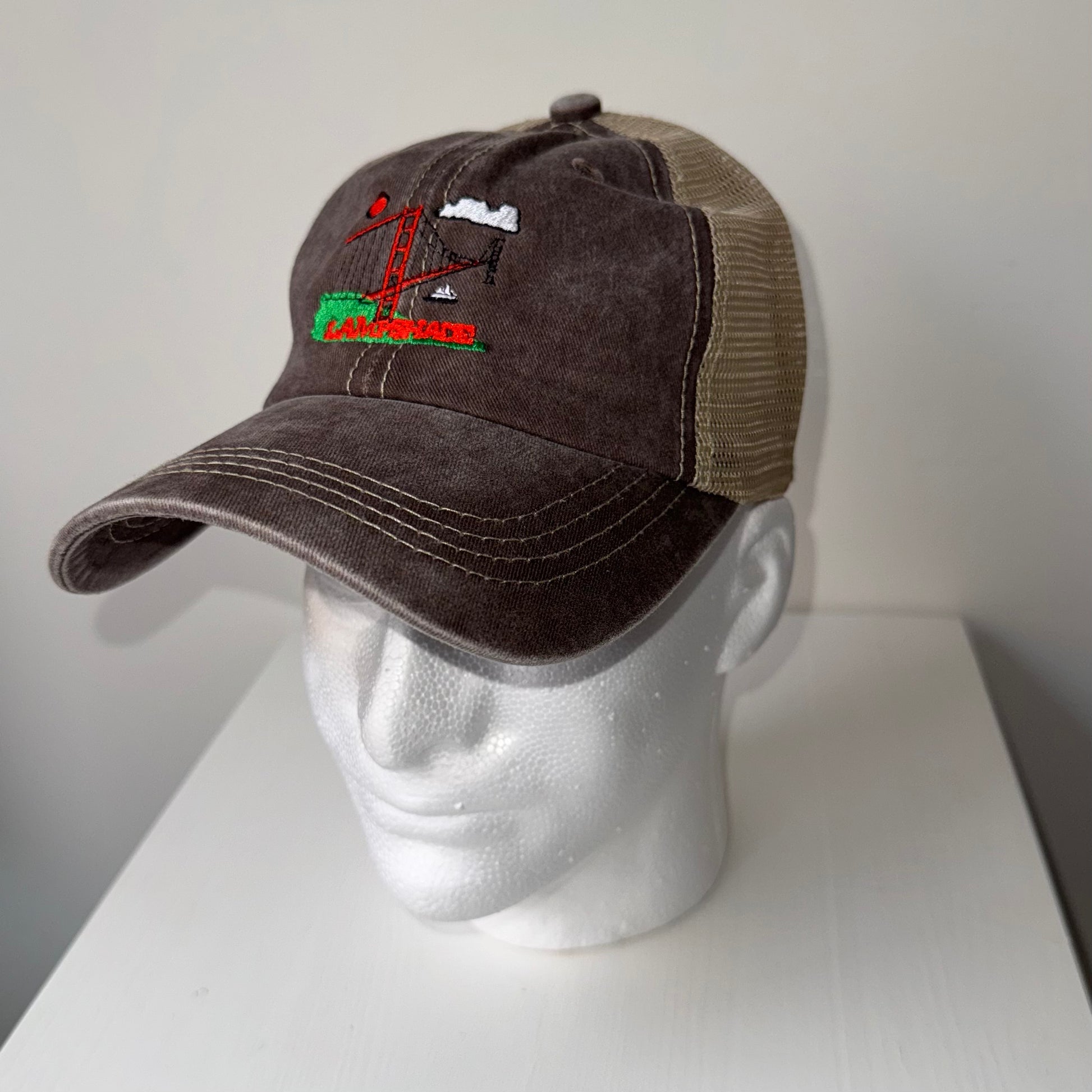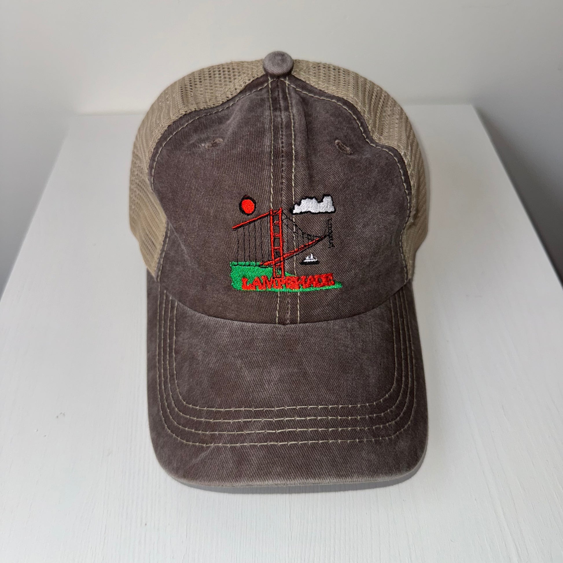 Lampshade bridge logo embroidered on a nice brown trucker cap.