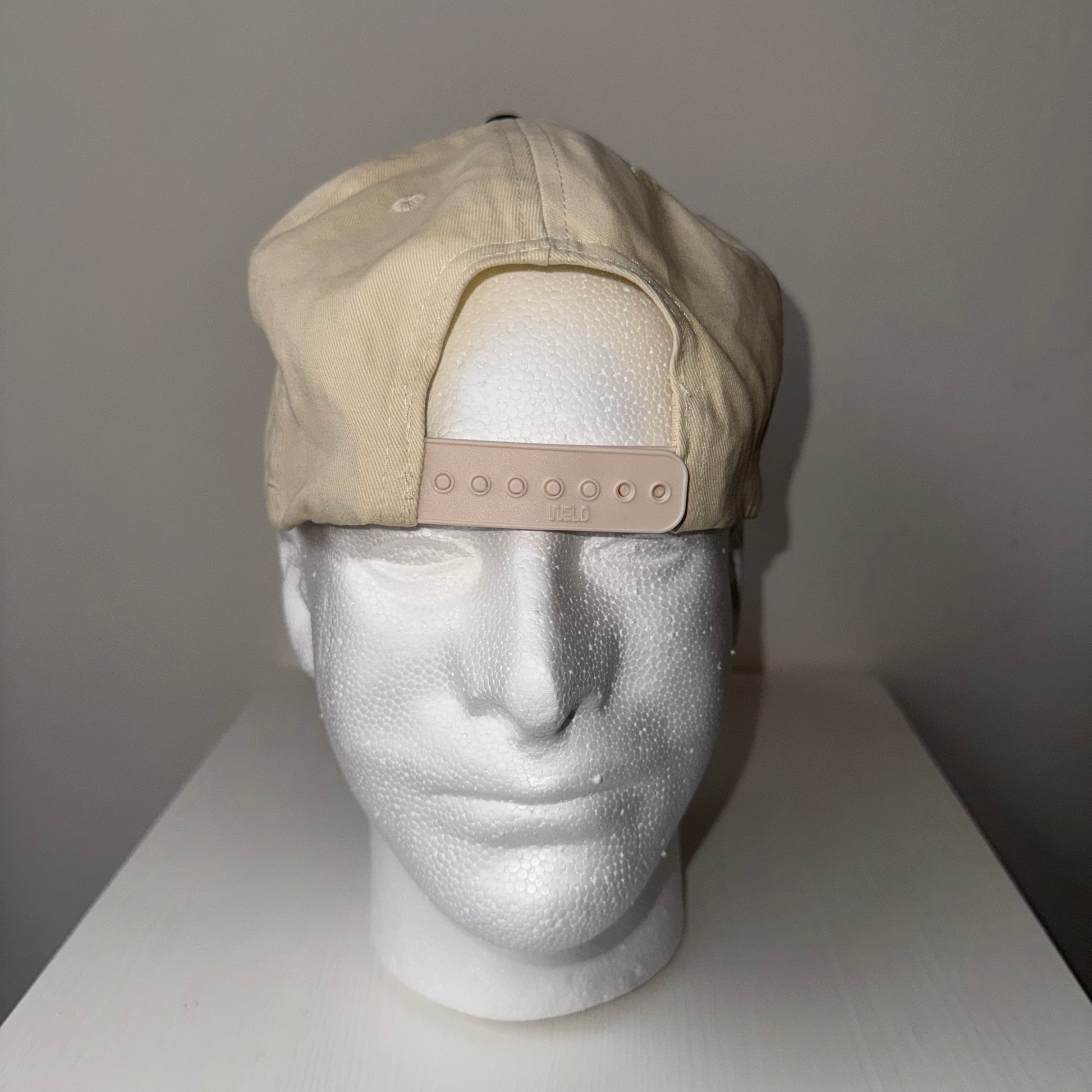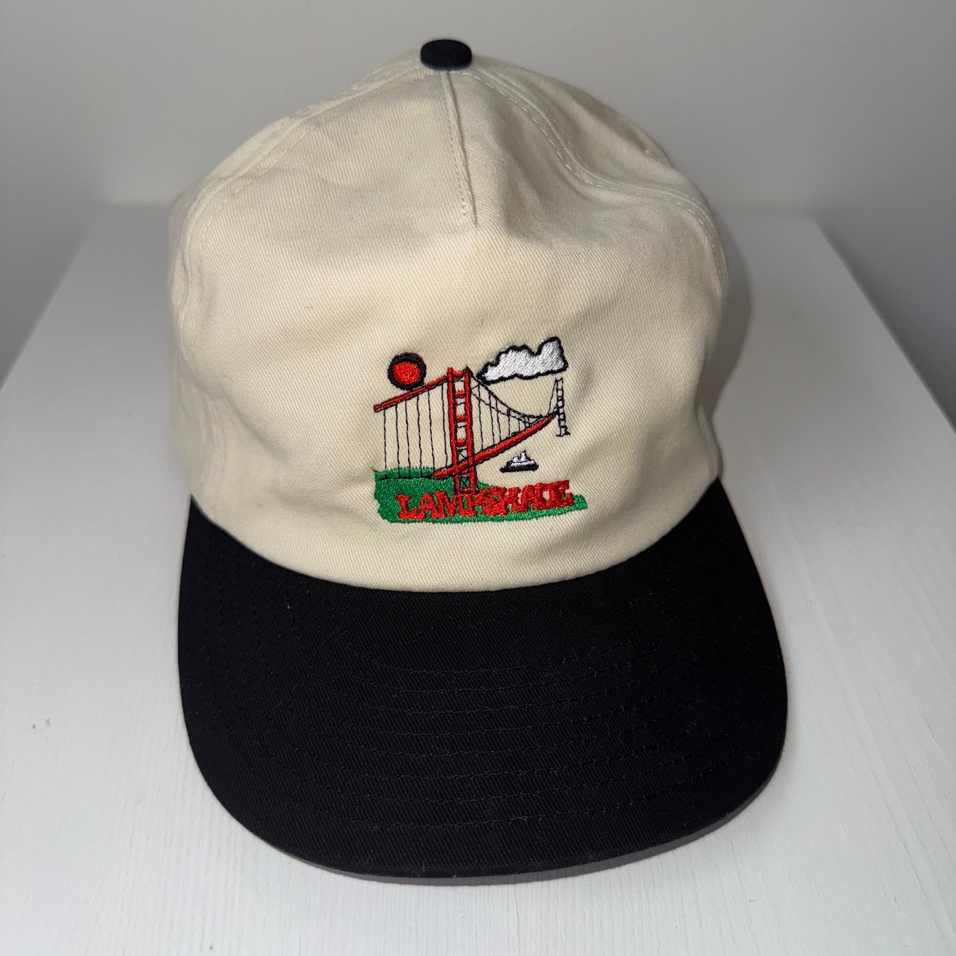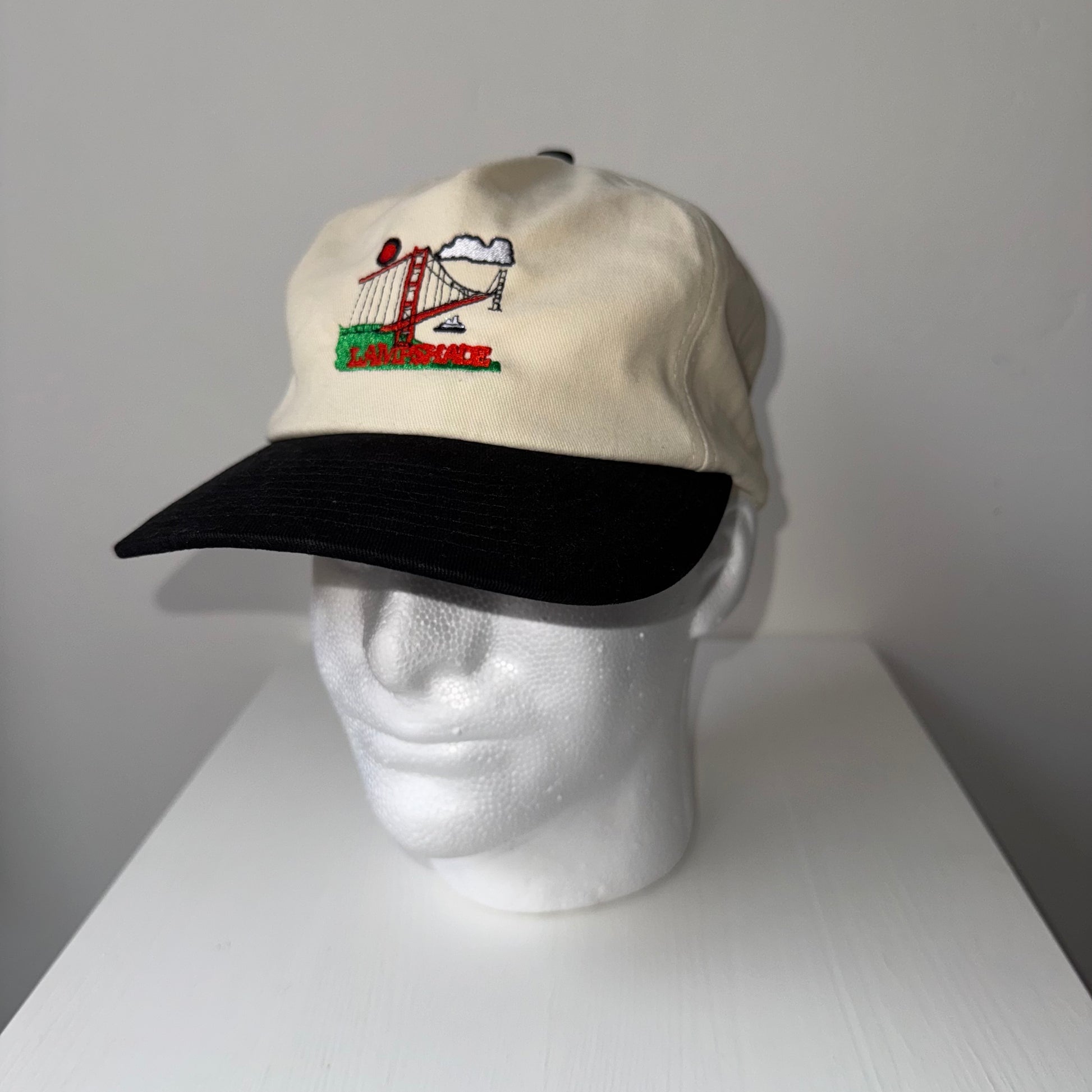 Lampshade bridge logo embroidered on a off white and black snap back.