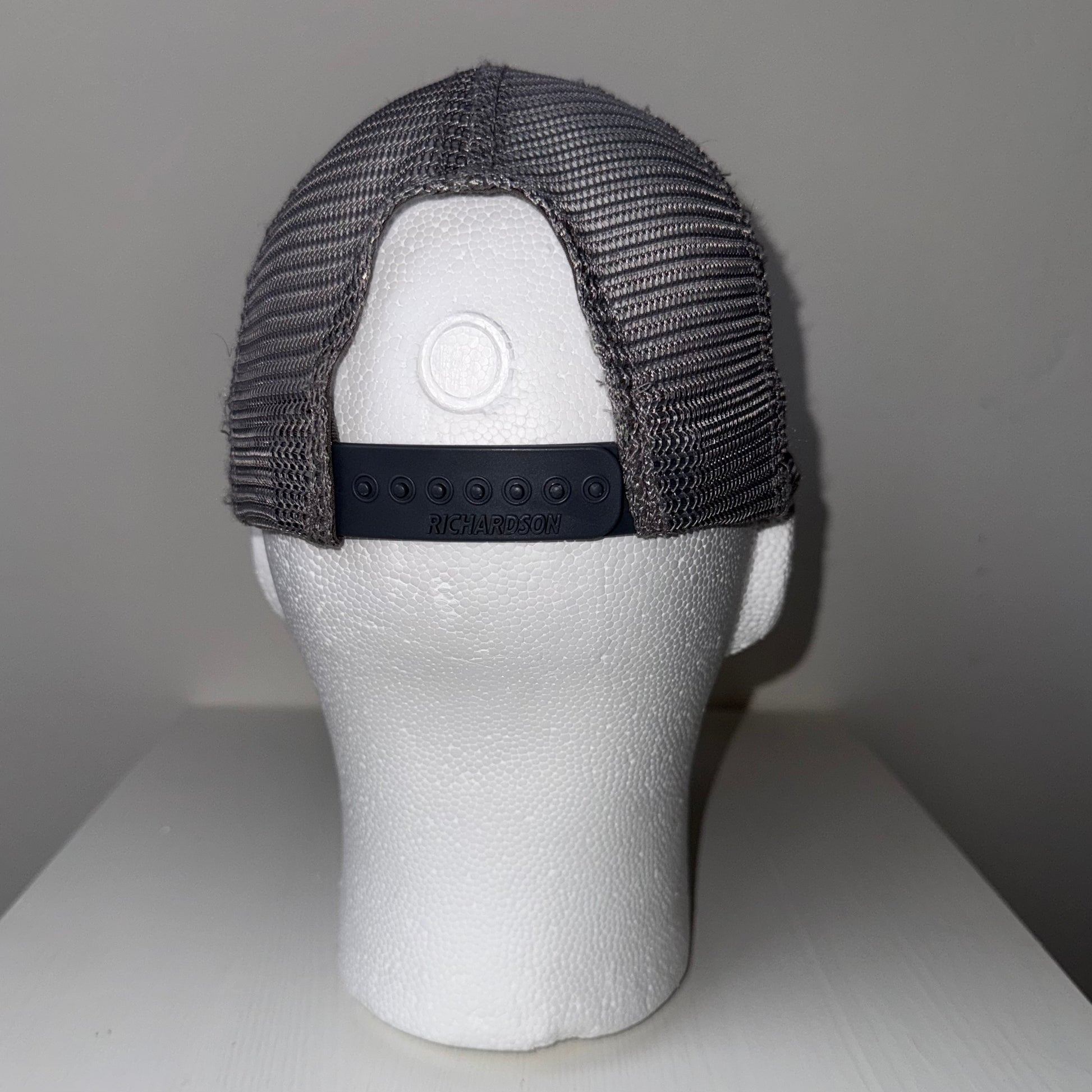 Lampshade Penguin logo embroidered on a nice black and grey trucker cap.